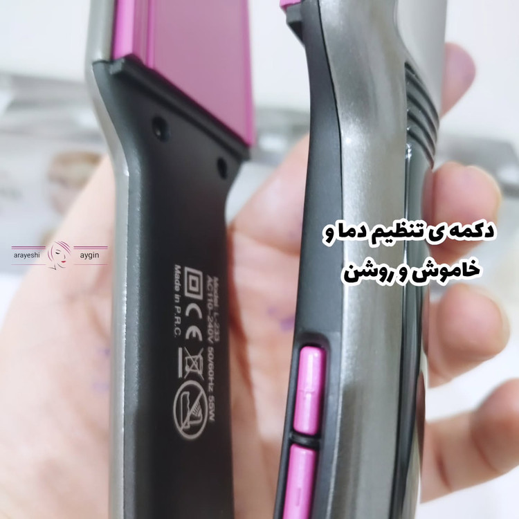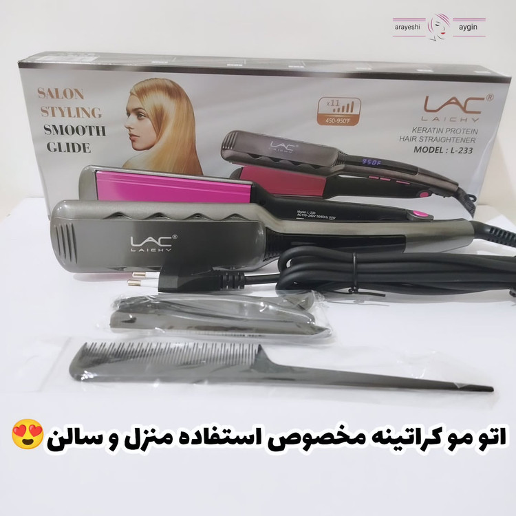 اتو مو کراتینه لایچی مدل l_233 دکمه ی قابلیت تنظیم دما داره از 950 درجه میشه تنظیم کرد سیمش 360 درجه میچرخه دکمه ی روشن و خاموش داره دارای صفحه ی پهن و سرامیکی هست گرمایش سریع پس از سی ثانیه